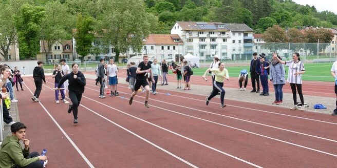 Bei kühlem, aber schönem Wetter fanden unsere diesjährigen Bundesjugendspiele im Stadion in Neustadt statt. Nach der Begrüßung durch unsere Sportlehrerin Frau Steiner nahmen alle Schülerinnen und Schüler an den drei Disziplinen Weitsprung, Sprint und Schlagballweitwurf teil. Zwischendurch konnte sich jeder auf der Tribüne erholen, die Mitschülerinnen und Mitschüler anfeuern oder auf der Rasenfläche Fussball spielen. Nach den Pflichtdisziplinen traten viele Schülerinnen und Schüler noch zu den freiwilligen 800m-Läufen gegeneinander an. Eines unserer jährlichen Highlights sind auch die abschließenden Pendelstaffeln, in denen jeweils die drei Klassen eines Jahrgangs gegeneinander laufen. Alle miteinander hatten an diesem Tag viel Spaß und Freude, sich den sportlichen Herausforderungen zu stellen. Einen herzlichen Glückwunsch an alle Beteiligten!